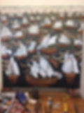 I used the composition of a famous sea battle painting of the Spanish Armada and just changed the style of the boats to the Cholan ships, also using acylic and gold leaf.